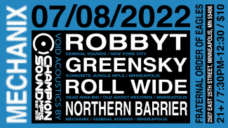 Robby T Website(s)Bandcamp Releases Live at Mechanix MPLS (22/09/2023) By Robby T ALL RELEASES Shows Mechanix: Seminal Sound Takeover Fri, Sep 22 - Sat, Sep 23 2023 Fraternal Order of Eagles Bass Ribbon Pines Music Festival Thu, Jul 21 - Sun, Jul 24 2022 Blue Ribbon Pines Disc Golf Course Mechanix July Edition Fri, Jul 8 - Sat, Jul 9 2022 Fraternal Order of Eagles ALL SHOWS