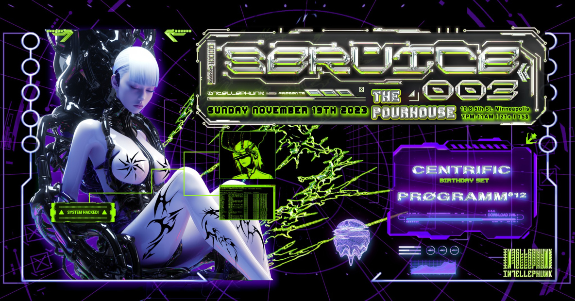 SERVICE Venue Pourhouse Downtown 10 5th St S Minneapolis, MN 55402 United States TimeSun, Nov 19 2023, 7 - 11pm Promoter Intellephunk Price$15.00 Artists Centrific PRØGRAMM⁶¹² Genres Techno Age Limit 21+ WebsiteFacebook