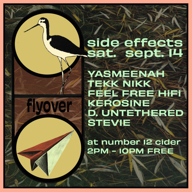 flyover presents: side effects Sat, Sep 14 2024, 2 - 10pm Promoter Flyover Venue Number 12 Cider Genre(s) House Techno Dancehall